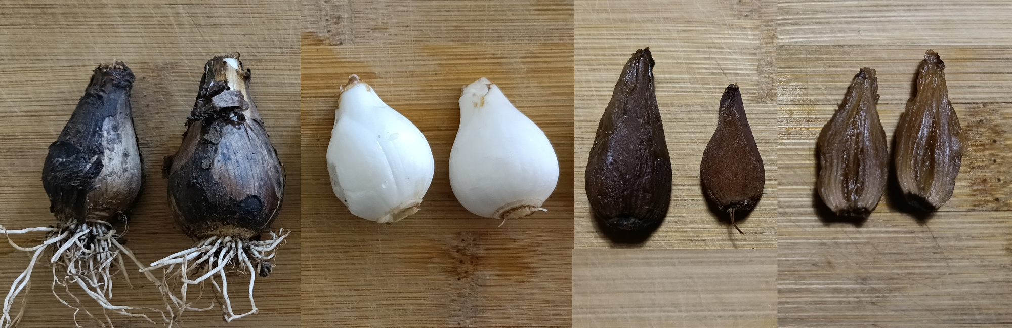 When fully cooked, the bulbs are dark brown, and have a sweet nutty flavor and a sticky texture. They are good this way. Some of us liked them even better fried with fat and salt, which lessens the sticky texture. The water the bulbs were cooked in is dark and has a syrupy taste, similar to the how the bulbs taste, but also reminiscent of butterscotch. I used this as an addition to sauces.