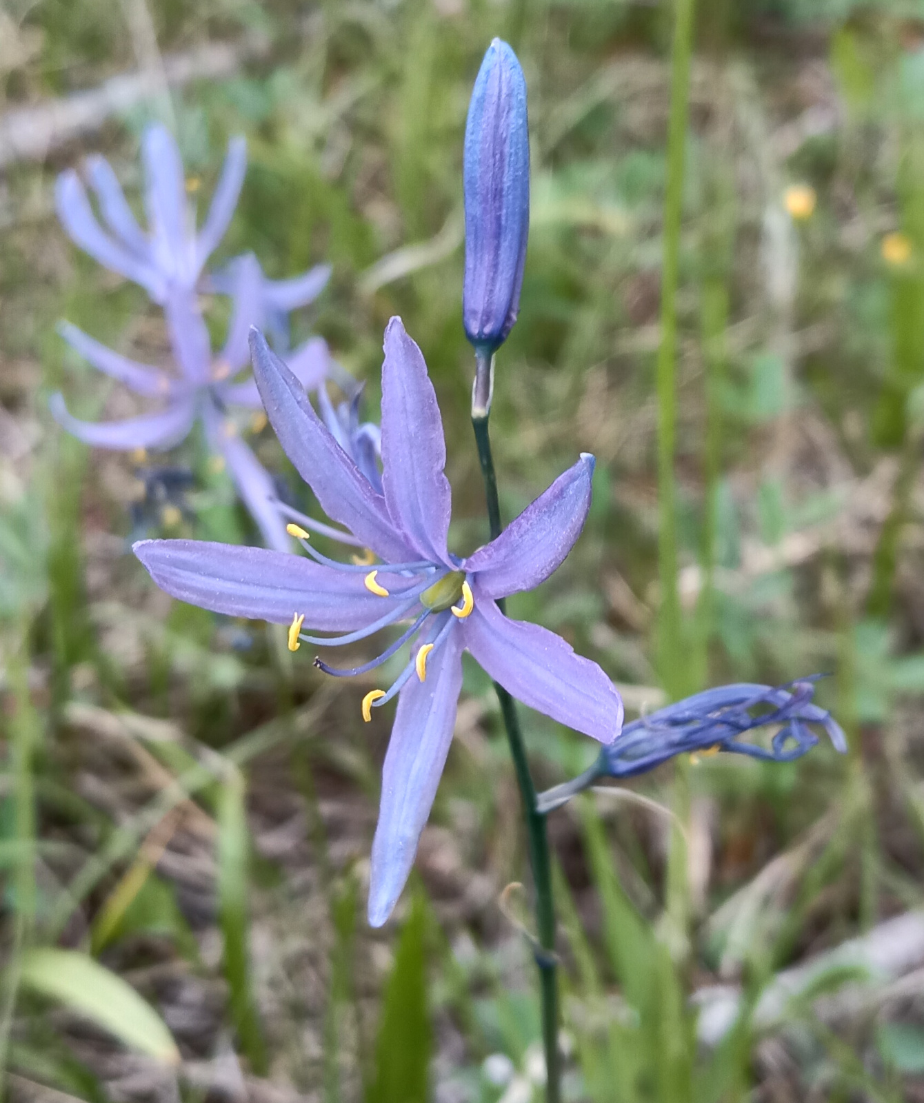 Camas seems to like growing in meadows which get plenty of water in the spring, but dry out in the summer. It does all its growth in the spring, and then the dry summer makes it less hospitable for competing plants. True to what the above information implies, I found Blue Camas growing where cattle were not allowed to graze, but nearby past a fence, where cattle could graze, I could not find any Camas growing.